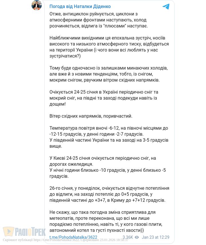 24-25 січня в Україні періодично йтиме сніг та мокрий сніг, на Півдні та Заході подекуди навіть із дощем, повідомила синоптик Наталка Діденко.