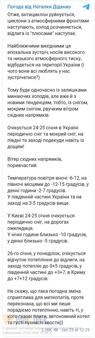 З понеділка 26 січня в країні очікується відчутне потепління до відлиги. На Заході потепліє до 0..+5 градусів, у південній частині – до +3...+7, в Криму буде до +7...+12 градусів.