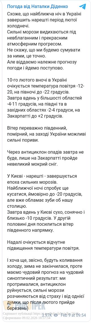 Найближча ніч завершить період лютого холоду в Україні, повідомила синоптик Наталка Діденко.