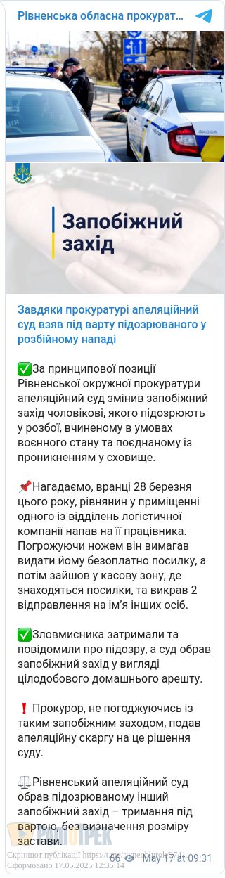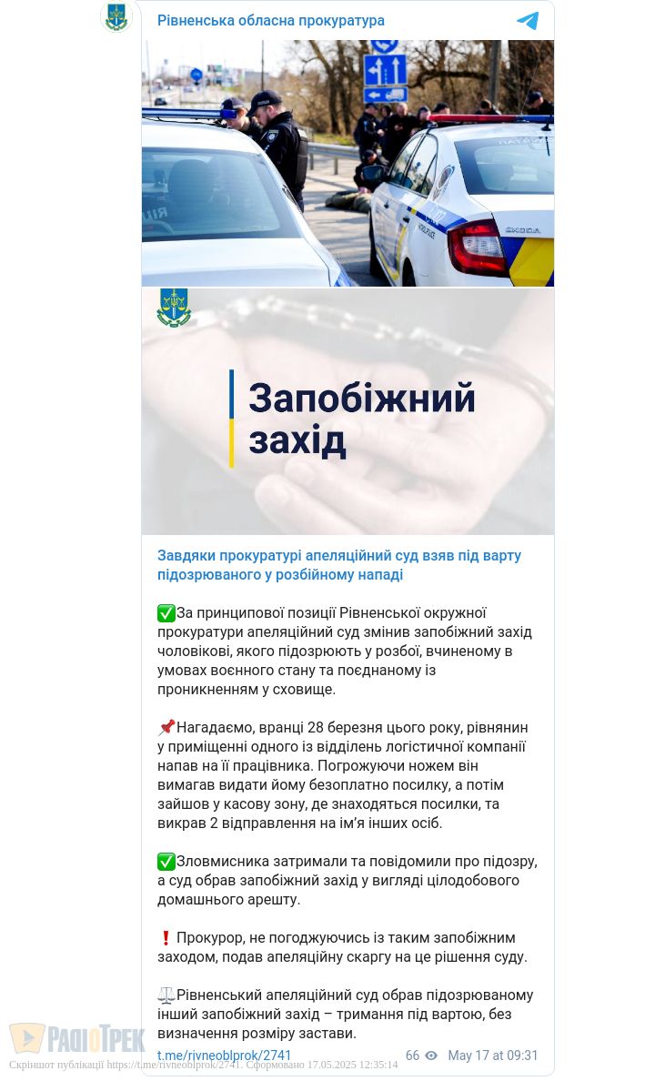 Зловмисника, який вчинив збройний напад у відділенні пошти в Рівному взяли під варту