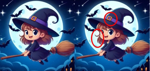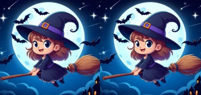 Перед вами два зображення молодої відьми, яка летить на мітлі. Здається, що вони повністю однакові, але це не так — між ними сховалися дві відмінності.