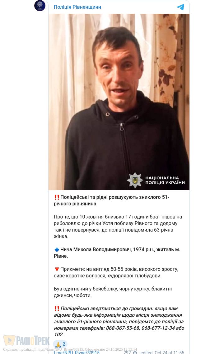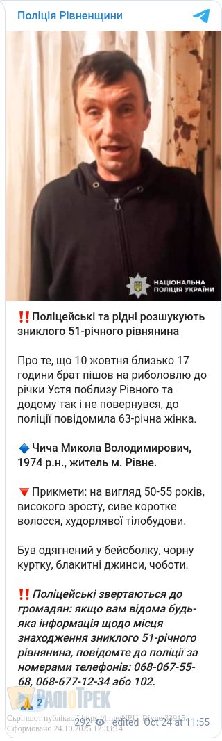 Поліцейські розшукують зниклого 51-річного рівнянина. Про його зникнення повідомила сестра. Відомо, що чоловік ще 10 жовтня пішов на риболовлю до річки Устя, але додому досі не повернувся.