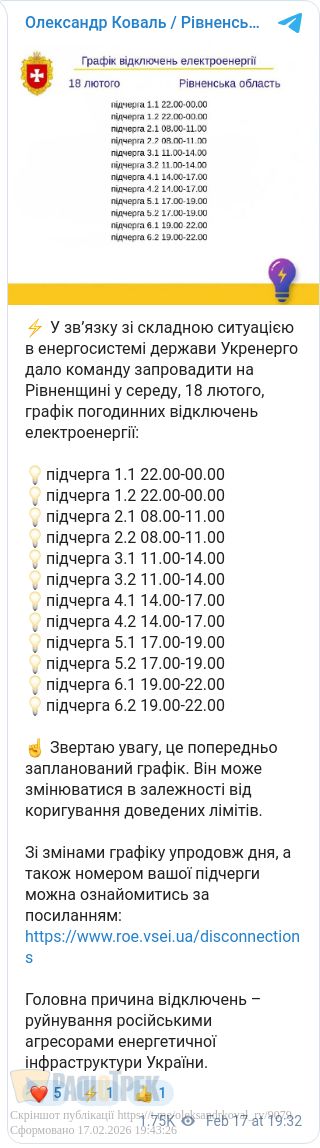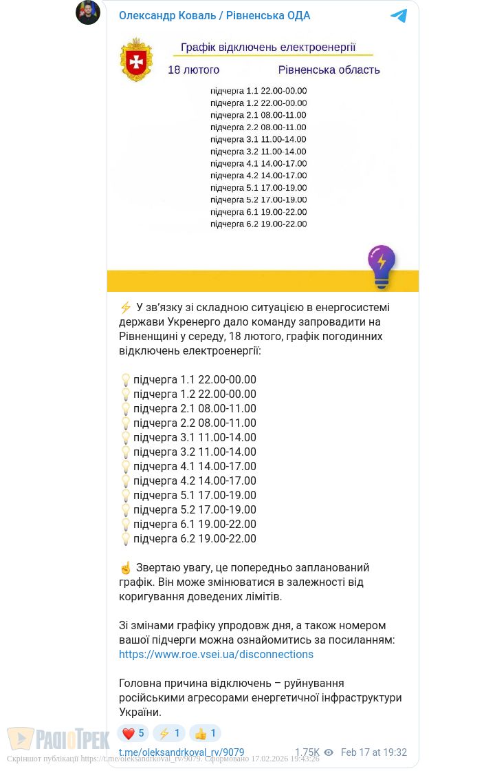 Знову без світла будуть всі черги: Графіки відключень на 18 лютого на Рівненщині
