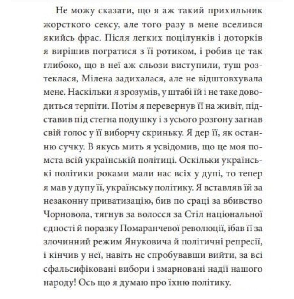 Я дер її, як останню сучку. В якийсь момент я усвідомив, що це моя помста усій українській політиці. Оскільки українські політики роками мали нас усіх у дупі, то тепер я мав у дупу її, українську політику. Я вставляв їй за незаконну приватизацію, бив по сраці за вбивство Чорновола, тягнув за волосся за Стіл національної єдності і поразку Помаранчевої революції, … за злочинний режим Януковича й політичні репресії, і кінчив у неї, навіть не спробувавши вийти, за всі сфальсифіковані вибори і змарновані надії нашого народу! Ось що я думаю про їхню політику".