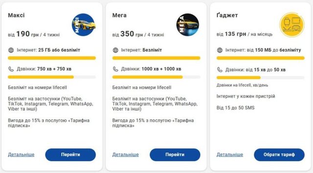 - «Мега» — від 350 грн на 4 тижні.
